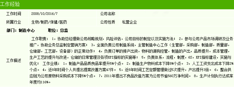 虽然这份工作描述的字数很多,但他提供了一组表现他的管理能力的数据:“良品率提升5%,物料成本下降8%,8年内个人提出改善方案47件”等等数据,这些都是企业管理的重要数据,至少他给了我:懂得归纳、有能力、会发现问题、为企业创造收入的印象。对于企业来说这是一个不容错过的简历。