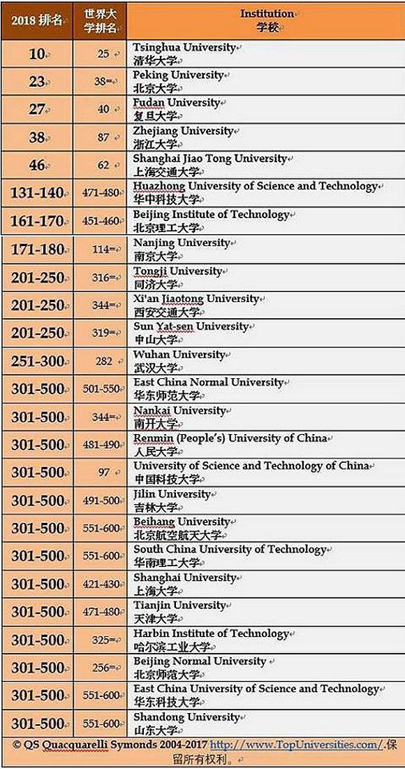 此次排名中,中国共有36所高校入围前500名,其中内地高校25所,中国香港高校4所,中国台湾高校7所。除清华外,中国内地还有4所大学进入全球50强,分别是北京大学(23名)、复旦大学(27名)、浙江大学(38名)和上海交通大学(46名)。其余内地排名靠前的高校还包括华中科技大学、北京理工大学、南京大学、中山大学、同济大学、西安交通大学等。